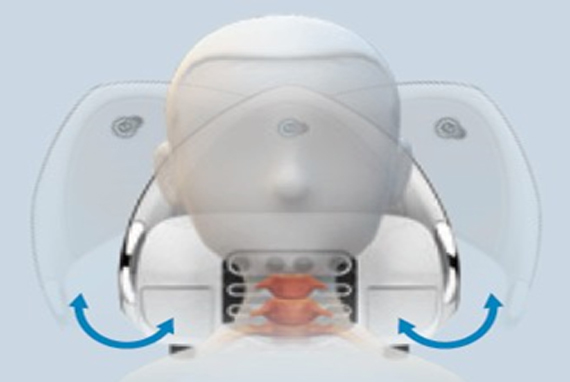 회전 각도 센서가 18도와 22도의 회전 각도를 조정하여 승모근의 지압 부위를 체형에 따라 다양하게 지압하여 줍니다. 견정혈을 중심으로 그 주변 근육과 혈자리를 지압 및 마사지 합니다.